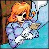 Description: a '60s woman operating a computer with ticker tape and blinkenlights